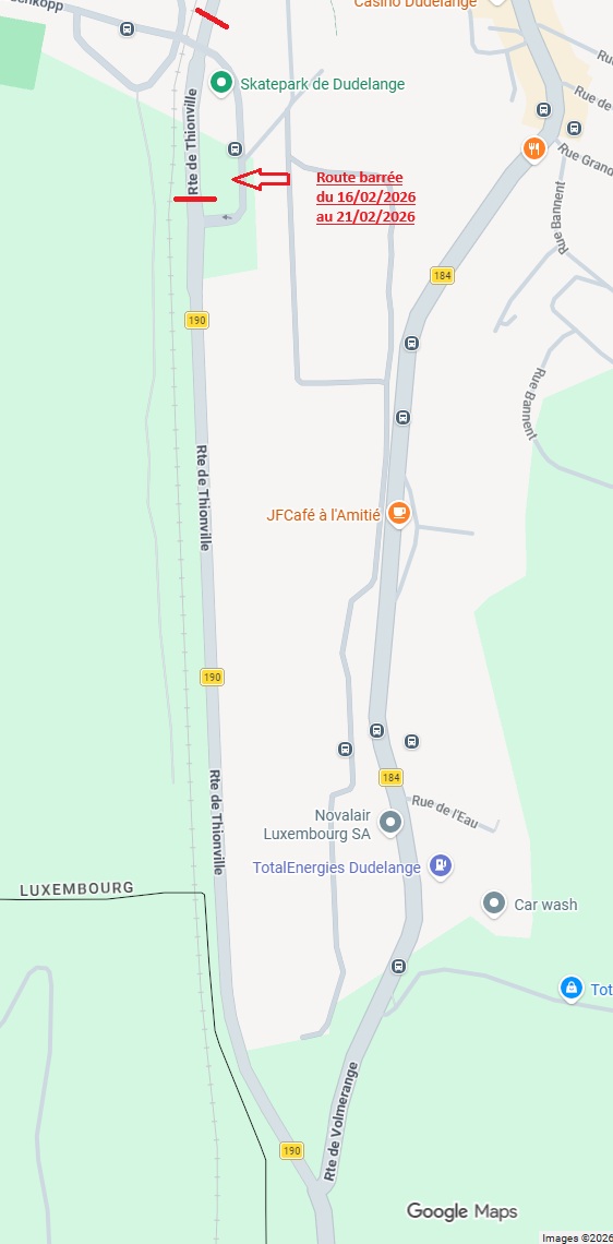 16/02/2026 – 21/02/2026 route barrée route de Thionville CR190 à la hauteur du pont (rue Reiteschkopp)