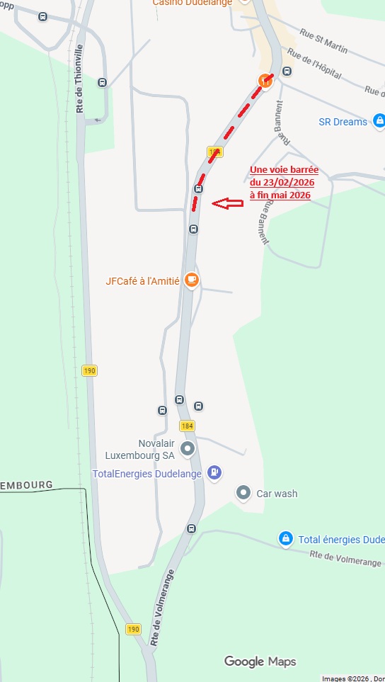 Vom 26. Januar bis zum 3. Februar 2026 (außer am Wochenende) findet von 9 bis 16 Uhr eine mobile Baustelle auf der Strecke zwischen der Brücke der Route de Thionville, der Kreuzung der Route de Thionville (CR 190) und der Route de Volmerange (CR 184) sowie der französischen Grenze statt.